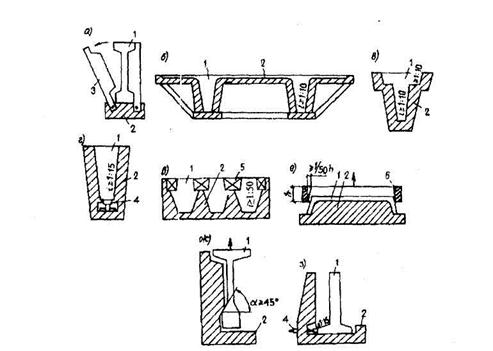 а - закругления в ребристой плите; б - фаска между полкой и стенкой в тавровой балке; в - сочетание фаски и закругления в уме фермы; г- смягчение острого угла в ригеле; д - закругление в отверстии для пропуска коммуникаций, строповки и т.п. 5.44. Отверстия в железобетонных элементах для пропуска коммуникаций, строповки и т. п. следует принимать по возможности небольшими и располагать в пределах ячеек арматурных сеток и каркасов так, чтобы не нужно было перерезать арматуру и армировать по месту. Углы отверстий желательно делать плавными (черт.5.7, д) 5.45. При проектировании бетонных и железобетонных конструкций их очертание следует принимать с учетом устройства и способа использования форм (опалубки). При применении форм с откидными бортами очертание изделия не должно препятствовать повороту борта (черт.5.8,а) при распалубке. При применении неразъемных форм для возможности извлечения изделия из них должны предусматриваться технологические уклоны не менее 1:10 (черт.5.8, б, в). В случае применения неразъемных форм с использованием выпрессовывания уклон должен быть не менее 1:15 (черт.5.8, г). При немедленной распалубке с обеспечением фиксированного (во избежание нарушения бетона) вертикального перемещения формующего элемента оснастки (черт.5.8, д, е)уклон должен быть не менее 1:50.