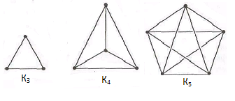 (i) Нулевым графом (или полностью несвязанным графом) называется граф с пустым множеством ребер, то есть нулевой граф — это просто множество точек (вершин). (ii) Полным графом называется граф, у которого каждая пара различных вершин связана ровно одним ребром. (iii) Двудольным графом называется граф, у которого множество вершин имеет разбиение {V1, V2} такое, что каждое ребро связывает вершины из множества V1 с вершиной из множества V2. (iv) Полным двудольным графом называется двухдольный граф, у которого каждая вершина множества V1 связана с каждой вершиной множества V2 единственным ребром. (v) Простым графом мы называем граф, который не имеет петель или множественных ребер, то есть для того, чтобы назвать граф простым не должно быть двух ребер, соединяющих одну и туже пару вершин и не должно быть ребер, соединяющих вершину саму с собой. Пример 1.2. Так как полный граф — это простой граф, то у полного графа нет петель, и каждая пара различных вершин соединена единственным ребром. Поэтому полный граф однозначно задается числом своих вершин. Полный граф Кn с n вершинами может быть описан так: Кn имеет множество вершин V = {v1, v2,..., vn} и множество ребер Е = {еij: 1 Очевидно, что граф Кn является правильным с валентностью (n-1), так как каждая вершина связана с каждой из остальных (n-1) вершин посредством одного ребра. Полные графы с тремя, четырьмя и пятью вершинами показаны на рис. 3.