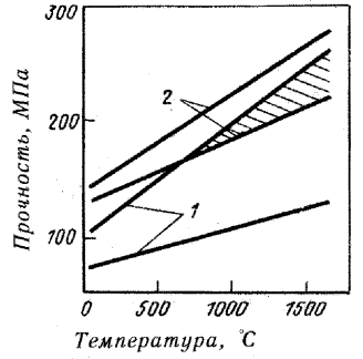 Рисунок 4.9 – Зависимость прочности при испытаниях на растяжение УУКМ от температуры (УУКМ трехмерного армирования; распределение прядей 2 х, 2 у, 3 z; прочность на растяжение в направлениях: 1- х, 2 – у)