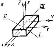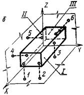 Рис. 1. Комплект баз (а) и опорные точки (б) при базировании призматической заготовки (детали): I, II, III — базы; 1...6 — опорные точки, символизирующие двусторонние связи заготовки (детали) с системой координат