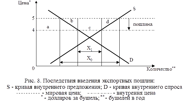 Эта диаграмма и выводы из нее аналогичны примеру с импортным тарифом, приведенному на рис. 5. Экспортный налог в размере 1 доллара за единицу товара делает его экспорт менее прибыльным, и производители возвращают часть товарной продукции на внутренний рынок. Это снижает уровень внутренних цен с 5 долларов (уровня мировых цен) до 4 долларов за единицу товара. В новых условиях равновесия производители предпочтут перебросить часть ресурсов в какую-нибудь другую сферу; в то же время спрос отечественных потребителей на данный товар несколько возрастет. Влияние налогообложения экспорта на благосостояние нации легко подсчитать. Производители терпят убытки, получая только 4 доллара за единицу товара вместо 5 долларов. Их потери в общей сложности составляют область Потребители получают в результате снижения цен выигрыш в размере области а. Размер собираемых и распределяемых государством доходов от экспортных пошлин, соответствующих объему экспорта Х1, равен области с. В целом страна теряет области b и d – потери экспортеров, не компенсируемые ничьим выигрышем. Экспортирующая страна может использовать экспортные пошлины в своих интересах, если она обладает на мировом рынке монопольной властью. Подобно оптимальному тарифу в условиях монополии страны на мировом рынке, можно найти и размер оптимальной экспортной пошлины. Ее величина будет прямо пропорциональна числу стран-импортеров, находящихся в зависимости от поставляемого на их внутренний рынок товара из рассматриваемой нами страны-экспортера. В основе политики налогообложения экспорта часто лежит именно упование на монопольное положение страны на мировом рынке, вынуждающее зарубежные страны переплачивать за импортируемый товар. На практике в отношении экспорта чаще используется не налогообложение, а политика субсидирования. Использование этой политики представляется несколько парадоксальным, потому что эти же самые страны в отношении импорта проводят политику ограничения. Субсидирование же экспорта одновременно является и субсидированием импорта. Это происходит из-за того, что экспортные субсидии способствуют повышению обменного курса национальной валюты, а следовательно, удешевляют приобретение иностранных товаров в данной стране. Субсидирование экспорта идет вразрез с международными соглашениями. Одно из положений ГАТТ оценивает экспортные субсидии как «нечестную конкуренцию» и разрешает импортирующим странам принимать ответные меры путем взимания протекционистских «компенсационных пошлин». Существует множество способов государственного субсидирования экспорта в обход требований ГАТТ. 1. Государство может использовать средства налогоплательщиков для предоставления низкопроцентных займов самим экспортерам или их иностранным клиентам. 2. Государство осуществляет непосредственные затраты по стимулированию сбыта экспортной продукции за рубежом, организуя рекламу и предоставляя дешевую информацию о конъюнктуре экспортного рынка. 3. Налоговая система предусматривает предоставление фирмам налоговых льгот в зависимости от объема производимых на экспорт товаров и услуг. В среднем экспортные субсидии невелики, но для отдельных товаров, а также компаний они достигают очень больших размеров. В целом же эти субсидии в обрабатывающей промышленнос