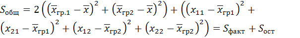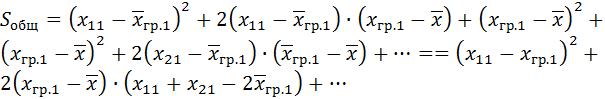 Вычтем и прибавим к каждому наблюдаемому значению на первом уровне групповую среднюю Выполнив возведение в квадрат, и, учитывая, что сумма всех удвоенных произведений равна нулю, получаем:
