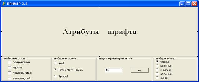 Упражнение 1.1 По аналогии создайтеобработчикидля остальных пунктов главного меню. Упражнение 1.2 Создайтевспомогательное меню для компонента RichEdit. Например, с такими же командами как в пункте: настройки главного меню. Пример 3.2 Сконструируйте форму изображенную на рисунке. Напишите обработчики для компонентов в нижней части окна. Их действия относятся к надписи на панели: «Атрибуты шрифта».