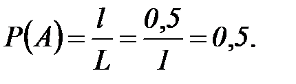 Определение: Геометрическая вероятность – это вероятность попадания точки в область (отрезок, часть плоскости и т.д.). Пример: Дан отрезок [0; 1] = L. На этот отрезок случайным образом ставится точка. Определить вероятность того, что эта точка попадает на левую половину отрезка (между точками 0 и 0,5). Решение: Все возможные исходы испытания соответствуют точкам отрезка 0 ≤ x ≤ 1. Пусть l = [0; 0,5]. Благоприятные исходы соответствуют точкам отрезка l: 0 ≤ x ≤ 0,5. Т.к. этих точек бесконечно много, то m = ∞ и n = ∞. За вероятность рассматриваемого события примем отношение длин этих отрезков: