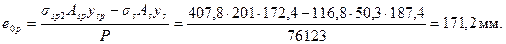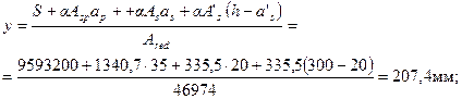Черт.2.2. К примеру расчета 1 Требуется определить значение и точку приложения усилия предварительного обжатия P (1)c учетом первых потерь и P с учетом всех потерь для сечения в середине пролета, принимая максимально допустимое натяжение арматуры. Расчет. Ввиду симметрии сечения расчет ведем для половины сечения плиты. Определяем геометрические характеристики приведенного сечения согласно п.2.33, принимая площадь бетона A =730·30+50·270+60·270/2+97,5·15 =21900+13500+8100+1462,5 = 44962,5 мм2; приведенная площадь Ared = A + aAsp + aAs + aA ' s = 44962,5+6,67·201 + 6,67·50,3·2 = 44962,5+1340,7+671 = 46974 мм2; статический момент сечения бетона относительно нижней грани ребра S = 21900·285+13500·135+8100·180+1462,5·48,7= 9593200 мм3; расстояние от центра тяжести приведенного сечения до нижней грани ребра ysp = y - ар = 207,4 – 35 = 172,4 мм; ys = y - as = 207,4 - 20 = 187,4 мм; y'sp = h - a'p – у = 300 - 20 - 207,4 = 72,6мм;