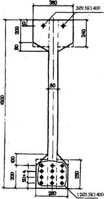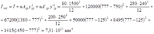 Черт.2.3. К примеру расчета 2 Расчет. Определяем геометрические характеристики приведенного сечения согласно п.2.33, принимая коэффициент Для упрощения расчета высоту свесов полок усредняем. Площадь сечения бетона А = 1500·80+280·240+200·250 = 120000+67200+50000 = 237200 мм2; площадь приведенного сечения Ared = A + aAsp + aA ' sp =237200+5·1699+5·283 = 237200+8495+1415 = 247110 мм2; расстояние от центра тяжести сечения арматуры S до нижней грани балки (учитывая, что сечения всех четырех рядов арматуры одинаковой площади) ар= (50+100+150+200)/4 = 125 мм; статический момент сечения бетона относительно нижней грани балки S = 120000·750+67200·1380+50000·125 = 1,89·108 мм3; расстояние от центра тяжести приведенного сечения до нижней грани балки ysp = y - ар = 777 – 125 = 652 мм; y'sp = h - a'p – у = 1450 - 777 = 673 мм; момент инерции приведенного сечения