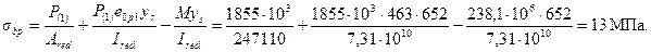 Согласно п.2.25 максимально допустимое значение σsp без учета потерь равно σsp = 0,8 Rs,n = 0,8·1400 = 1120 МПа. Определим первые потери. Потери от релаксации напряжений в арматуре согласно п.2.26 равны Потери от температурного перепада между упорами стенда и упорами согласно п.2.28 при Δ t = 65° равны Δ σsp 2 =1,25Δ t = 1,25·65 = 81 МПа. Потери от деформации анкеров согласно п.2.29 при Δ l = 2 мм и l = 20 м равны Потери от деформации стальной формы отсутствуют, поскольку усилие обжатия передается на упоры стенда. Таким образом сумма первых потерь равна Δ σsp (1) = 85+81+18 = 184 МПа > 100 МПа т.е. потери в дальнейшем не корректируем. Усилие обжатия с учетом первых потерь и его эксцентриситет равны P (1) = (Asp + A'sp)(σsp - Δ σsp (1)) = (1699+283)(1120-184) = 1855·103 Н; В соответствии с п.2.34 проверим максимальное сжимающее напряжение бетона σbp от действия усилия P(1), вычисляя σbp по формуле (2.8) при ys= у = 777 мм и принимая момент от собственного веса М равным нулю: т.е. требование п.2.34 выполняется. Определяем вторые потери напряжений согласно пп.2.31 и 2.32. Потери от усадки равны Δ σsp 5 = εb,shEs = 0,00025·18·104 = 45 МПа. Потери от ползучести определяем по формуле (2.7), принимая значения φb,сr и Еb по классу бетона равному Rbp = 20 Мпа (т.е. по классу В20, поскольку Rbp < 0,7·40 = 28 МПа). Согласно табл.2.6 (φb,сr =2,8, согласно табл.2.5 Еb =27,5·103 МПа, Для арматуры S Для арматуры S' Определим напряжение бетона на уровне арматуры S по формуле (2.28) при ys = ysp = 652 мм, принимая момент от собственного веса балки в середине пролета. Нагрузка от веса балки равна: (здесь l = 17,5 м - расстояние между прокладками при хранении балки); Напряжение бетона на уровне арматуры S' (т.е. при ys = - y's = -673 мм) Тогда потери от ползучести равны: для арматуры S для арматуры S' Напряжения σbp с учетом всех потерь равны: для арматуры S σsp 2= σsp - Δ σsp (1) - Δ σsp 5 - Δ σsp 6 = 1120 - 184 - 45 - 145 = 745 МПа; для арматуры S' σ'sp 2= σsp - Δ σsp (1) - Δ σsp 5 - Δ σ'sp 6 = 1120 - 184 - 45 - 26 = 865 МПа. Определим усилие обжатия с учетом всех потерь Р и его эксцентриситет e 0 p.