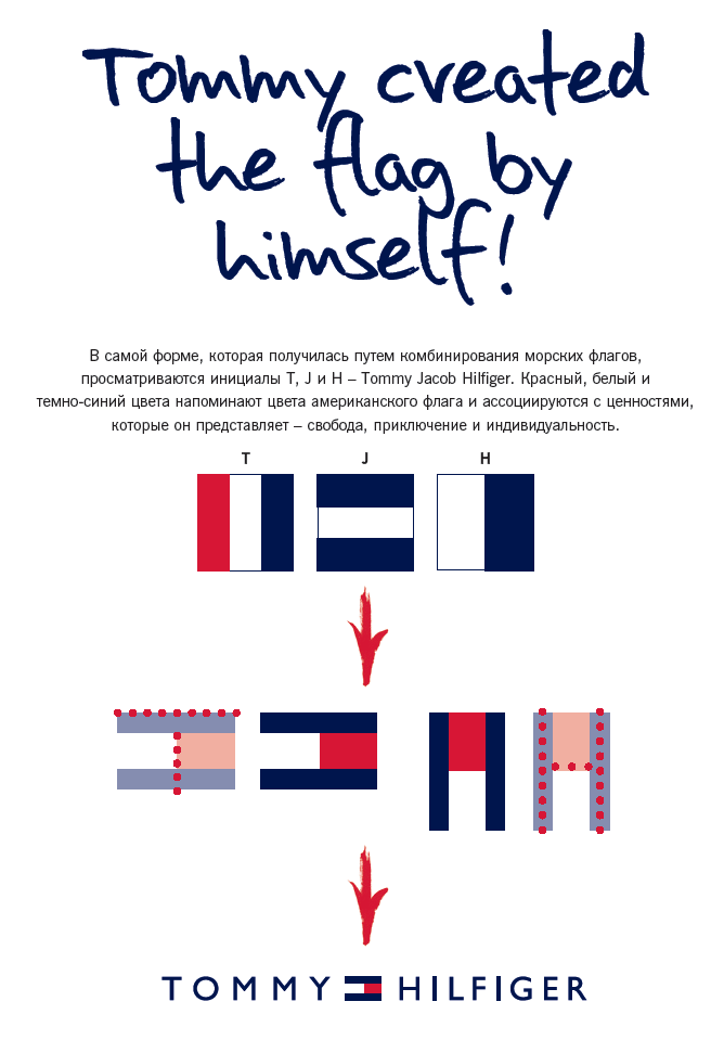 В самой форме, которая получилась путем комбинирования морских флагов, просматриваются инициалы (основа морской семафорной азбуки)T, J и H – Tommy Jacob Hilfiger.Красный, белый и темно-синий цвета напоминают цвета американского флага и ассоциируются с ценностями, которые он представляет – свобода, приключение и индивидуальность.