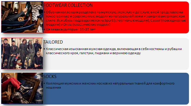Линии мужской и женской одежды подразделяются на два основных направления - Sportswear и Denim.