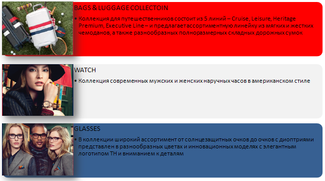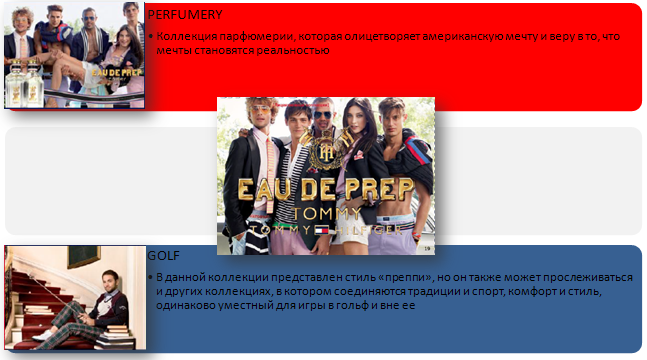 DENIM В Denim представлены модели fasion и basic, denimmatrix (джинсовые низы). Целевая аудитория – молодые энергичные люди, поэтому по ценовой категории он немного дешевле и отличается качеством от линии Sportswear. В линии Denim в основном модели приталенные – Slim-модели, в нем много фишек, характерных для молодого поколения – рваные джинсы, джинсы с кожаными вставками, различными потертостями, футболки с принтами. В целом, все то, что модно. Также он отличается характерной этикеткой и лейблом на товаре – Hilfiger Denim.