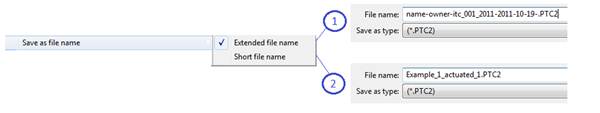 There are two default predefined save options file names generated automatically. You can choose one from two options: extended (1) or short (2) file name.