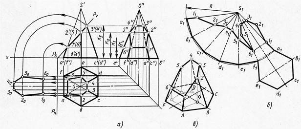Рис. 57. Правильная шестиугольная пирамида, пересеченная фронтально-проецирующей плоскостью Р, показана на рисунке 58. Как и в предыдущем примере, фронтальная проекция сечения совпадает с фронтальным следом PV плоскости. Горизонтальную и профильную проекции фигуры сечения строят по точкам, которые являются точками пересечения плоскости Р с ребрами пирамиды. Действительный вид фигуры сечения в этом примере найдем способом совмещения (плоскость Р вместе с фигурой сечения совмещена с горизонтальной плоскостью проекций). Рис. 58. Развертка усеченной пирамиды с фигурой сечения и фигурой основания построена следующим образом. Сначала строят развертку неусеченной пирамиды, все грани которой, имеющие форму треугольника, одинаковы. На плоскости намечают точку s1 (вершину пирамиды) и из нее, как из центра, проводят дугу окружности радиусом R, равным действительной длине бокового ребра пирамиды. Действительную длину ребра можно определить по профильной проекции пирамиды, например отрезка sʺeʺ или sʺbʺ ≠ так как эти ребра параллельны плоскости W иизображаются на ней действительной длиной. Далее по дуге окружности от любой точки, например а1, откладывают шесть одинаковых отрезков, равных действительной длине стороны шестиугольника – основания пирамиды. Действительную длину стороны основания пирамиды получаем на горизонтальной проекции (отрезок ab). Точки a1 – f1 соединяют прямыми с вершиной s1. Затем от вершины а1 на этих прямых откладывают действительные длины отрезков ребер до секущей плоскости. На профильной проекции усеченной пирамиды имеются действительные длины только двух отрезков - sʺ5ʺ и sʺ2ʺ. Действительные длины остальных отрезков определяют способом вращения их вокруг оси, перпендикулярной к плоскости Н и проходящей через вершину s. Например, повернув отрезок sʺ6ʺ около оси до положения, параллельного плоскости W, получим на этой плоскости его действительную длину. Для этого достаточно через точку 6ʺ провести горизонтальную прямую до пересечения с действительной длиной ребра SE (или SB). Отрезок sʺ60ʺ представляет собой действительную длину отрезка S6. Полученные точки 11, 21, 31 и т. д. соединяют прямыми и пристраивают фигуры основания и сечения. Линии сгиба на развертке проводят штрихпунктирной линии с двумя точками. Построение изометрической проекции усеченной пирамиды начинают с построения изометрической проекции основания пирамиды по размерам, взятым с горизонтальной проекции комплексного чертежа. Затем на плоскости основания по координатам точек 1 -6 соединяем, получаем фигуру сечения. Из вершины полученного шестиугольника проводят вертикальные прямые, на которых откладывают координаты, взятые с фронтальной или профильной проекций призм, например, отрезки К1. К2, К3 и т. д. Полученные точки 1 – 6 с вершинами шестиугольника, основания пирамиды, получим изометрическую проекцию усеченной пирамиды. Невидимые ребра изображают штриховыми линиями.
