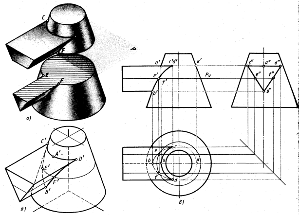 Рис. 64. В данном примере плоскость Р рассекает конус по окружности, с помощью которой находят горизонтальные проекции точек е и f. Во всех случаях перед тем как строить линию пересечения поверхностей на чертеже, необходимо представить себе эту линию в пространстве. На следующих образцах можно увидеть примеры построения линии пересечения различных геометрических тел.