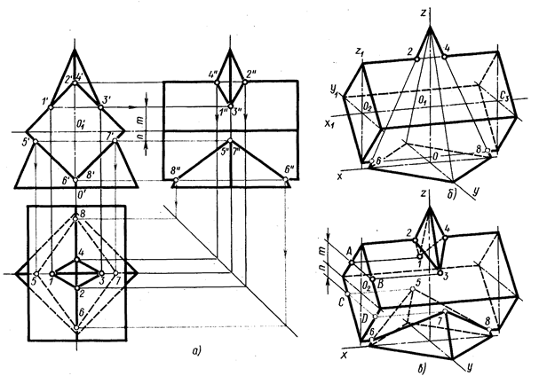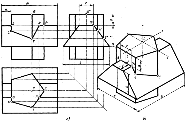 Рис. 66. На рисунке 67 показано построение проекции и изометрии линий пересечения поверхностей двух призм. На рисунке 68 показано построение проекции и диметрии линий пересечения поверхностей четырехугольной призмы с четырехугольной пирамидой.