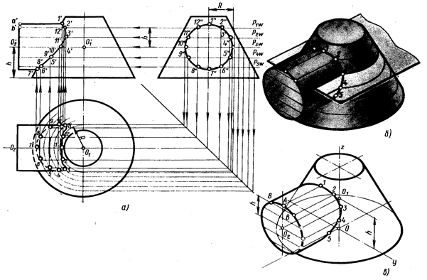 Рис. 68. На рисунке 69 показано построение проекции и изометрии линий пересечения поверхностей прямого кругового усеченного конуса, имеющего вертикальную ось, с цилиндром, расположенным горизонтально. На рисунке 70 показано построение проекции и изометрии линий пересечения поверхностей цилиндра и конуса, оси которых параллельны.