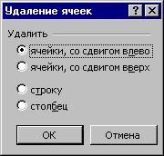 Удаление ячейки, строки, столбца Для этого: · выберите в строке меню команды Правка/Удалить; · в появившемся диалоговом окне Удаление ячеек (рис. 13), выберите нужный режим, щелкнув по нему мышью.