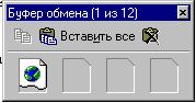 Рис. 13. Диалоговое окно Удаление ячеек 1-ый способ –через команды меню: · выделите ячейку, которую надо копировать; · выберите в строке меню команды Правка/Копировать; · активизируйте ячейку, в которую необходимо скопировать содержимое выделенной ячейки; · выберите в строке меню команды Правка/Вставить. Примечание. Можно использовать пиктограммы команд 2-ой способ с помощью контекстного меню: · подведите мышь к ячейке, которую надо копировать; · нажмите правую клавишу мыши, в результате появится контекстное меню, из которого выберите команду Копировать; · активизируйте ячейку, в которую надо копировать; · нажмите правую клавишу мыши и из контекстного меню выберите команду Вставить. 3-ий способ – методом перетаскивания в рядом стоящие ячейки: · подведите курсор мыши под нижний правый угол ячейки, которую надо копировать, курсор примет вид знака «плюс» (+); · нажмите клавишу мыши и, не отпуская ее, переместите курсор на ячейку, в которую надо копировать, отпустите клавишу мыши. Примечание. При копировании группы ячеек сначала их надо выделить, затем работать, используя 1-ый или 2-ой способ копирования При перемещении информации из одной ячейки в другую проводятся действия аналогичные приемам копирования, только вместо команды Копировать выбирается команда Вырезать ( Копируемая или вырезанная информация попадает в Буфер обмена. Буфер обмена хранит до 12 скопированных или вырезанных фрагментов (рис. 14), выбрать которые можно через панель Буфер обмена (Вид/Панель инструментов/Буфер обмена).