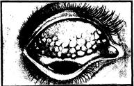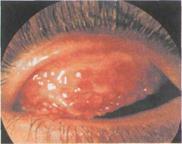 Зуд, ощущение «песка», светобоязнь. Кон-ва молочно-белого оттенка, на ней крупные, плотные, бледно-розовые разрастания «булыжная мостовая». Переходная складка и конъюнктива глазного яблока не изменены.