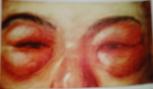 | выраженный синюшно-багровый отек век. Веки плотные. Отделяемое из глаз цвета мясных помоев, затем гнойное.