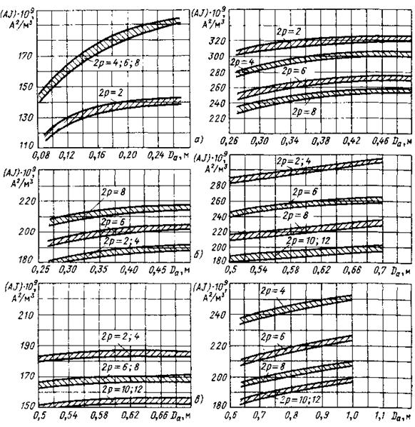 Рис. 4.2. Средние значения произведения AJ асинхронных двигателей со степенью зашиты: а – IP44, h < 132 мм; б – IP44, А = 160 ¸ 250 мм; в – IP44, h=280¸355мм; г – IP23, h = 160¸250 мм; д – IР23, h = 280¸355 мм; е – IP23 приUном = 6000 В Для этого по табл. 4.2 подбираются сечение q эл и число элементарных проводников n эл, составляющих один эффективный, таким образом, чтобы диаметр d элэлементарных проводников не выходил за указанные пределы, а их суммарная площадь сечения была близка к расчетному сечению эффективного проводника: