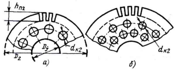 Рис. 5.12. Аксиальные вентиляционные каналы в сердечнике ротора: а — расположение каналов в один ряд (т к2=1); б — расположение каналов в два ряда (m к2 = 2)