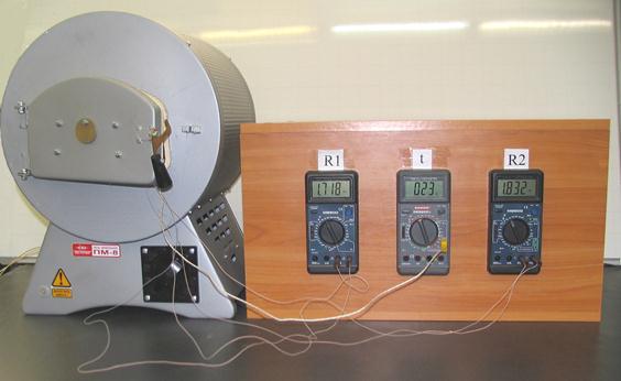 На рисунке 4.2 приведена фотография установки. Она состоит из следующих блоков: 1) муфельной электрической печи ПМ-8; 2) блока из трех цифровых приборов М890 (один служит для измерения температуры, два других − для измерения сопротивлений); 3) катушек из манганина и нихрома (на рисунке 4.2 не видны, так как находятся в печи); 4) зарядного устройства приборов.