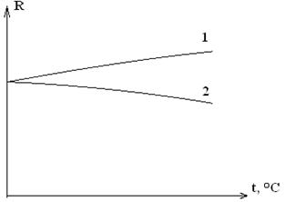 Рис. 4.3. Зависимость R = f(t) для нихрома (1) и манганина (2)