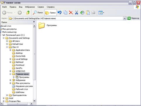 Рисунок 2. На верхньому рівні ієрархії автономного комп'ютера розміщується Рабочий стол. З нього починається робота на комп'ютері після запускання операційної системи Windows. На ньому розташовано: Мои документы, Мой компьютер, Мое сетевое окружение, Корзина. У правій ділянці вікна провідника показано вміст виділеної зліва папки. Зовнішній вигляд вікна може значно відрізнятися залежно від настроювань програми. Програму Проводник можна запустити кількома способами: Ø з головного меню: Пуск/Все программы/Стандартные/Проводник; Ø за допомогою ярлика до цієї програми, що можна установити на робочому столі; Ø подвійним клацанням значка Мой компьютер при натиснутій клавіші Shift; Ø з контекстного меню Мой компьютер — командою Проводник; Ø у будь-який момент вікно програми Мой компьютер може бути перетворене на Проводник за допомогою кнопки Папки на панелі інструментів. На панелі оглядача Папки крім папки, яка вміщує інші папки нижчого рівня, зображено знак «плюс», клацанням якого розкривається структура вкладених папок. При цьому знак змінюється на «мінус», а його клацання — закриває відкриті папки. Зручно відкривати і рухатися по ієрархії дерева папок, використовуючи стрілки керування курсором. Швидке виділення папки можна здійснити натисканням першого символу її імені. Для відображення папок усіх рівнів, що належать до будь-якої папки, слід виділити її в лівій ділянці вікна і натиснути клавішу * на цифровій панелі клавіатури. Перейти в папку вищого рівня (батьківську папку) можна таким чином: Ø відкрити список в адресній смузі, який розкривається, і вказати потрібну папку; Ø натиснути кнопку Вгору; Ø натиснути клавішу Backspace — це один з найшвидших способів переходу в папку вищого рівня. Отримати нову інформацію про зміст папки дає змогу команда Обновить у меню Вид.Їїяк правило, використовують при заміні гнучкого диска, під час роботи з мережними дисками та з веб-сторінками. Команда Упорядочить значки в меню Виддає змогу розташувати папки та файли у вікні в заданому порядку: имя, тип, размер, изменен. Після вибору останньої команди щойно створені папки відображатимуться першими. Команда Выстроить значки в меню Видрозташовує значки рівними рядами, якщо раніше вони розміщувалися хаотично. Для вирівнювання значків можна використовувати команду Упорядочить значки автоматически.