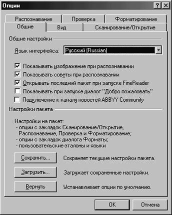Програма FineReader може видавати повідомлення для користувача на кількох мовах. Вибір мови здійснюється за командою Сервис — Опции (Tools — Options). На вкладці «Общие» («General») у списку «Язык интерфейса» необхідно вибрати потрібну мову і підтвердити вибір клацанням мишею на кнопці «ОК».