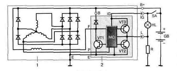 Рис.3.19. Электрическая схема генератора с подсоединением вывода фазы генератора на регулятор напряжения: 1 – генератор, 2 – регулятор напряжения, HL – контрольная лампа, SA – выключатель зажигания, МС – микросхема регулятора напряжения