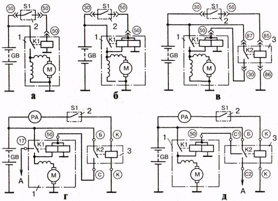 Рис. 4.12. Схемы управления электростартерами: а – с однообмоточным реле; б – с двухобмоточным реле; в, г, д – с дополнительным реле; 1 – электростартер; 2 – выключатель зажигания и стартера: 3 – дополнительное реле; А – к выводу добавочного резистора