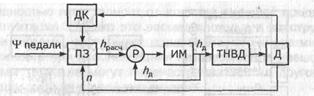 Регулирование в зоне частичных характеристик сводится к вычислению расчетного положения рейки топливного насоса, сравнению этого расчетного значения с реальным положением рейки и приведению рейки в нужную точку по оптимальному закону в соответствии с рассогласованием. Структурная схема системы показана на рис. 8.10. Она состоит из программного задатчика положений рейки ПЗ, вычисляемых по значениям частоты вращения коленчатого вала двигателя п, положению педали управления подачей топлива ψ педали и информации от датчиков коррекции ДК; регулятора Р, вычисляющего рассогласование между расчетным значением положения рейки h расч и действительным h д; исполнительного механизма ИМ, включенного в контур регулятора и формирующего интегральную составляющую топливного насоса высокого давления ТНВДи двигателя Д.