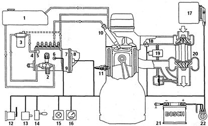 Рис. 8.12. Система впрыска Bosch с рядным топливным насосом высокого давления: 1 – топливный бак; 2 – топливоподкачивающий насос; 3 – топливный фильтр; 4 – рядный топливный насос высокого давления; 5 – электромагнитный клапан отключения топливоподачи; 6 – датчик температуры топлива; 7 – датчик положения рейки; 8 – управляющий электромагнит; 9 – датчик частоты вращения; 10 – форсунка; 11 – датчик температуры охлаждающей жидкости; 12 – датчик положения педали управления топливоподачей; 13 – датчик включения рабочего тормоза, вспомогательного тормоза, сцепления; 14 – пульт управления; 15 – аварийная лампа и диагностический разъем; 16 – датчик скорости автомобиля; 17 – электронный блок управления; 18 - датчик температуры воздуха; 19 – регулятор давления наддува; 20 – турбокомпрессор; 21 – аккумуляторная батарея; 22 – выключатель стартера и приборов