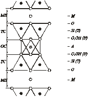 Рисунок 1.73 – Схема атомной структуры слюдяного слоя: О – атомы кислорода; Si – атомы кремния (T – тетраэдрический, А – октаэдрический, М –межслоевые катионы); ОН – гидроксил; F – атом фтора; ОС – октаэдрическая сетка; ТС – тетраэдрическая сетка; МП – межслоевой промежуток
