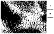 то есть функции Если уравнение (2.135) имеет различные количества решений, т.е. В кристаллах со спайностью структурные дефекты по обе стороны от плоскости расслоения при образовании ювенильной поверхности различны [59]. Это объясняет наличие электронной мозаики на поверхностях диэлектриков [25], но не позволяет, на первый взгляд, объяснить появление электрически заряженных областей на поверхности металлов, а именно эти заряды создает, по терминологии Т.И. Дистлера, подробно изучавшего это явление, своеобразный «электрический рельеф» поверхности поликристаллических металлов [42-43]. Этот «рельеф» формируется декорированием поверхности порошком антрахинона и даже осажденными на поверхности каплями воды (рис. 2.33). Рассмотрим две (любые) частицы (два кристалла в поликристаллическом металле) с общей границей (рис. 2.34). Каждая из частиц представляет собой монокристальный объект. При выходе на межзонную границу по обе стороны от нее находятся различные кристаллографические плоскости, то есть вдоль нормали к границе периодичность расположения атомов различна, то есть, различны и структуры блоховских зон. Поверхностные потенциалы также различны. Следовательно, можно считать, что энергетическое состояние электрона в частицах 1 и 2 вблизи межзонной границы также различны. Необходимо отметить, что уже только по указанной причине следует говорить о том, что поверхностный, точнее, межзеренный, потенциальный барьер будет существовать. При этом потенциалы по обе стороны от этого барьера, относящиеся к контактирующим частицам, будут различны.
