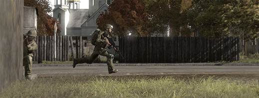 Примечание: Если группа попала под огонь во время пересечения, нужно использовать много дыма, а элементы прикрытия должны вести подавляющий огонь. В следующем примере вы видите пример пересечения улицы командой.