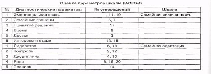Описание методики Методика состоит из списка утверждений (от 1 до 20). Задача испытуемого заключается в том, чтобы дважды оценить каждое утверждение по степени его выраженности, используя пятибалльную шкалу: почти никогда — 1, редко — 2, время от времени — 3, часто — 4, почти всегда — 5. В первом случае задача испытуемого оценить реальное семейное функционирование, во втором — идеальное, то есть такое, каким хотелось бы его видеть. Определение типа структуры семьи. При обработке подсчитывается количество баллов, полученных при суммировании четных и нечетных утверждений. Количество баллов, полученное при суммировании нечетных пунктов, Определение уровня удовлетворенности семейной жизнью. Разница между К расширенным возможностям методики следует отнести исследования более частного уровня, а именно диагностических параметров шкал сплоченности и адаптации (табл. 1). Таблица 1