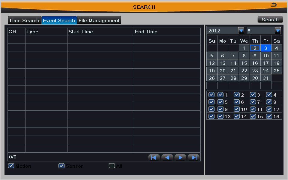 Рис. 5-2 Шаг 2: пользователь может выбрать дату и канал; отметить критерий поиска по движению, датчику или все соответственно. При нажатии кнопки Поиск, поиск информации о событии будет отображаться в списке событий. Шаг 3: дважды щелкните по определенному файлу записи в списке событий для воспроизведения. Шаг 1: войдите в настройку поиска (Search configuration)à управление файлами (file management), см. Рис 5-3: