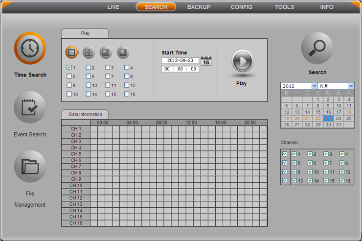 Удаленное воспроизведение и резервное копирование (Remote playback & backup) Данный видеорегистратор поддерживает удаленный поиск по времени, поиск событий и управления файлами. (Remote playback by Time Search) Войдите в поиск (search)à поиск по времени (time search). Нажмите кнопку "Поиск" для входа в интерфейс поиска по времени, пользователь может удаленно воспроизвести записи, как показано ниже: