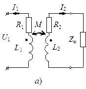 Трансформатор представляет собой техническое устройство, использующее явление взаимоиндукции для передачи энергии из одной цепи в другую. Это позволяет разделить цепи, преобразовать напряжение и токи, согласовать сопротивления. Обычно трансформатор содержит ферромагнитный сердечник, однако при этом он становится нелинейным устройством. Ниже рассмотрим трансформатор без ферромагнитного сердечника (рис. 3.26, а), называемый иногда воздушным трансформатором.