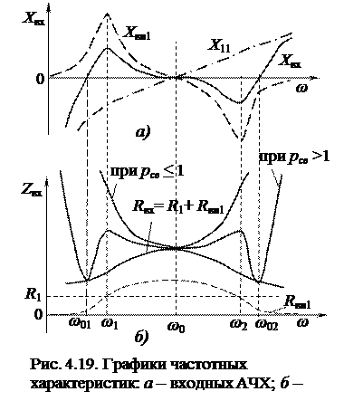 На рис. 4.19 представлены графики частотных характеристик Zвх, Xвх, Rвх, Xвн1, Rвн1 с одинаковыми ОКК, т.е. при R 1= R 2= R; L 1= L 2= L; С 1 = С 2= С; Q 1 = Q 2= Q. При этом используется параметр связи При одинаковых добротностях контуров