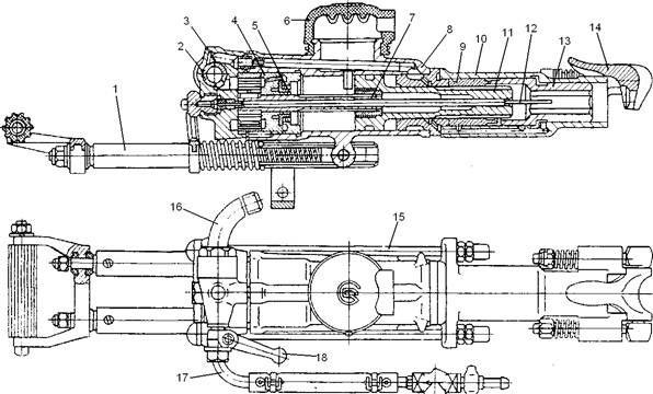 Рис 1. - Устройство переносного перфоратора: 1 - виброгасящее устройство; 2 – воздушный кран; 3 – головная часть; 4 - воздухораспределительное устройство; 5 – клапан; 6 - глушитель шума; 7 - геликоидальный винт; 8 - цилиндр; 9 – ствол; 10, 13 – буксы; 11 – поршень; 12 – водяная трубка; 13 – букса; 14 – буродержатель; 15 – стяжные винты; 16, 17 – патрубки; 18 – рукоятка управления; 19 - кран