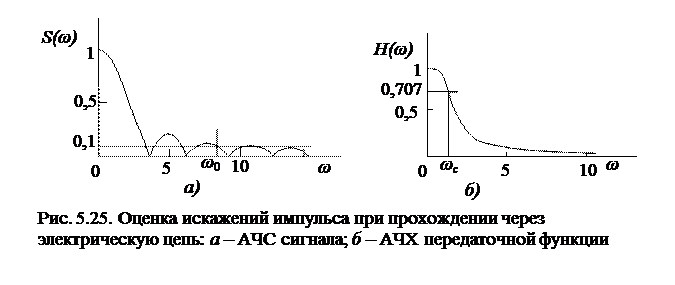 Затем следует построить амплитудно-частотную характеристику передаточной функции цепи (рис. 5.25, б) Далее на графике амплитудно-частотного спектра определяется ширина спектра, которую можно определить, проведя линию, параллельно оси абсцисс на уровне 0,1 от максимального значения амплитудно-частотного спектра. Последняя точка пересечения проведенной линии графиком амплитудного спектра определит его ширину (см. рис. 5.25, а). Для амплитудно-частотной характеристики определяется полоса пропускания цепи. Для этого на графике проводится линия на уровне 0,707 от максимального значения. Диапазон частот, в котором график АЧХ лежит выше проведенной линии, является полосой пропускания цепи. Сопоставляя ширину спектра сигнала с полосой пропускания цепи, можно дать качественную оценку искажениям сигнала на входе цепи. Так, если ширина спектра меньше полосы пропускания цепи, то искажения сигнала будут минимальными.