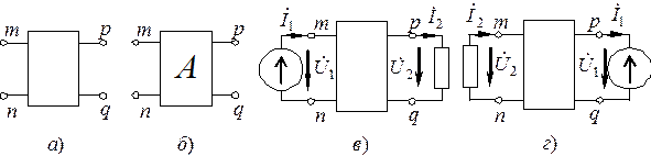 Рис. 7.1. Схемы четырехполюсников: а – пассивного; б – активного; в – при прямом включении; г – при обратном включении