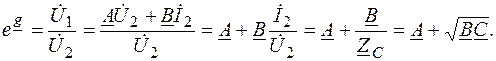 Аналогичным образом можно определить А -коэффициенты симметричного четырехполюсника через вторичные параметры Z C и g. Дополняя предыдущее уравнение уравнением AD – BC = 1 и принимая A = D, получим из первого уравнения
