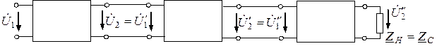 П р и м е р 7.2. Три симметричных четырехполюсника, имеющих параметры ZC и g, соединены каскадно (последовательно один за другим). Определить входное сопротивление и постоянную передачи каскада, если сопротивление нагрузки Z H= Z C. Р е ш е н и е. 1. Учитывая, что входное сопротивление четырехполюсника при согласованном режиме включения, т.е. при Z H = Z C, также равно Z вх= Z C, получим, что все три четырехполюсника оказались включенными в согласованном режиме и входное сопротивление каскада тоже равно Z вх общ= Z C.
