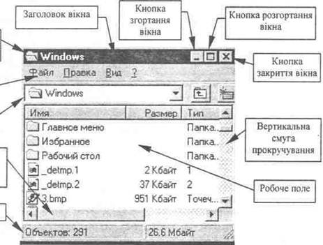 Щоразу, відкриваючи нову програму, Windows поміщає її в нове окреме вікно, що з'являється на робочому столі Кожне вікно має рядок заголовка, в якому знаходиться маленька піктограма програми, а слідом йдуть назва вікна та три кнопки зміни розміру: Свернуть, Развернуть (або Восстановить, якщо вікно вже розгорнуте на увесь екран) і Закрыть. Нижче рядка заголовка знаходиться рядок меню зі списками,щорозкриваються, різними для кожної конкретної програми. Якщо вікно обладнане панеллю інструментів, та вона включена в даний час, то панель інструментів розташовується під рядком меню. Нижче рядка меню та панелі інструментів (якщо вона є) розташовується робоче поле вікна. Якщо розмір робочого поля вікна такий, що бачити відразу увесь його вміст не можна, то вікно доповнюється ще вертикальною (справа) та горизонтальною (знизу) смугами прокручування, які можна використовувати для переносув робочому полі нових частин вмісту вікна, в самій нижній частині вікна в деяких вікнах розміщується рядок стану. Рядок стану відображає різноманітну інформацію про поточний стан програми у вікні. В операційній системі Windows є декілька видів вікон: 1. Вікна папок по суті є певного роду контейнерами для збе-реження об'єктів. До речі, одним з об'єктів, вкладених у такий контейнер, може бути інша папка — у цьому разі вона називається вкладеною папкою 2. Діалогові вікна мають інші функції — вони призначені для керування роботою системи та її обслуговувань, тому виконують роль своєрідних міні-панелей керування. Щоразу, коли користу- вач має визначити якісь параметри чи змінити настроювання або дати відповідь на запит, що надходить від системи, використо- вуються діалогові вікна. 3. Вікно додатка — це фактично робоче поле, в межах якого ви можете виконувати роботу з додатком: набирати і редагувати тексти, створювати малюнки, керувати відтворенням музики й відео, переглядати сторінки World Wide Web. У тих випадках, коли виникає необхідність якось налаштувати роботу додатка чи задати якісь параметри, на допомогу знову приходять діалогові вікна. 4. Вікна довідкової системи можна розглядати як різновид діалогових вікон. У них немає нічого такого, чого не буває в діа- логових вікнах, але все-таки вони дещо своєрідні, тому ми роз- глянемо їх окремо. Найбільш поширені в ОС Windows типові (вікна папок) та діалогові вікна.