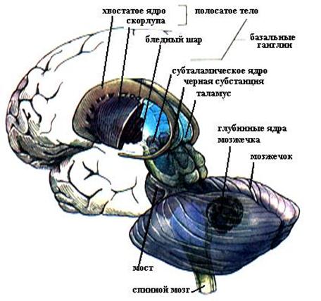 Базальные ганглии, названные так гистологами прошлого века, представляют собой структуры ядерного типа, которые располагаются в толще белого вещества переднего мозга ближе к его основанию. У млекопитающих к базальным ганглиям относятся сильно вытянутое в длину и изогнутое хвостатое ядро и заложенное в толще белого вещества чечевицеобразное ядро. Двумя белыми пластинками оно подразделяется на три части: наиболее крупную, лежащую латерально скорлупу и бледный шар, состоящий из внутреннего и внешнего отделов (рис.3.2.). Перечисленные структуры часто объединяют под общим названием «стриопаллидарный комплекс», от слов «Стриатум - полосатое тело» и «паллидум – бледный шар». К стриопаллидарной системе часто относят также субталамическое ядро (люисово тело) и черную субстанцию среднего мозга, которые образуют с базальными ганглиями функциональное единство. Полосатое тело состоит главным образом из мелких клеток, аксоны которых направляются к бледному шару и черной субстанции среднего мозга. Базальные ганглии, как и мозжечок, представляют собой вспомогательную двигательную систему, которая функционирует обычно не сама по себе, а в тесной связи с корой большого мозга и кортикоспинальной системой двигательного контроля. Действительно, большинство входящих сигналов базальные ганглии получают от коры большого мозга, а почти все выходящие из этих ганглиев сигналы возвращаются назад к коре.