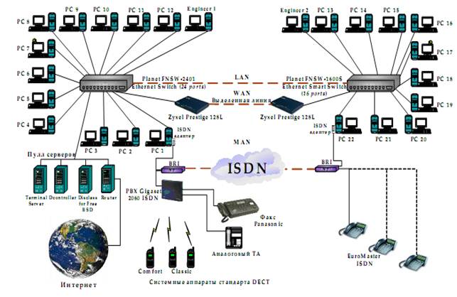 - Terminal Equipment ISDN (3 digital telephones Euro Master). - Digital telephone station Gigaset-2060 to 10 numbers for connection subscribers through wireless access standard DECT. - 2 computer (PC1, PC2), equipped with a terminal adapter (Boards that support the standard ISDN).