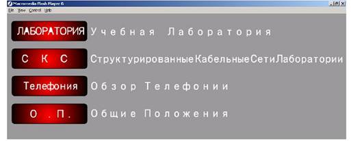 To familiarize with the principles of the organization telephony in the Laboratory, go to “Telephony”. In this section you can know the type of equipment to provide laboratory telephone service. To return to the main menu, press the «Main». For information on the types of patch cords and connectors that are used in the lab, go to “General position” in the menu bar. After completion of viewing exit «SKS» and proceed to the second part of the job of the laboratory work.